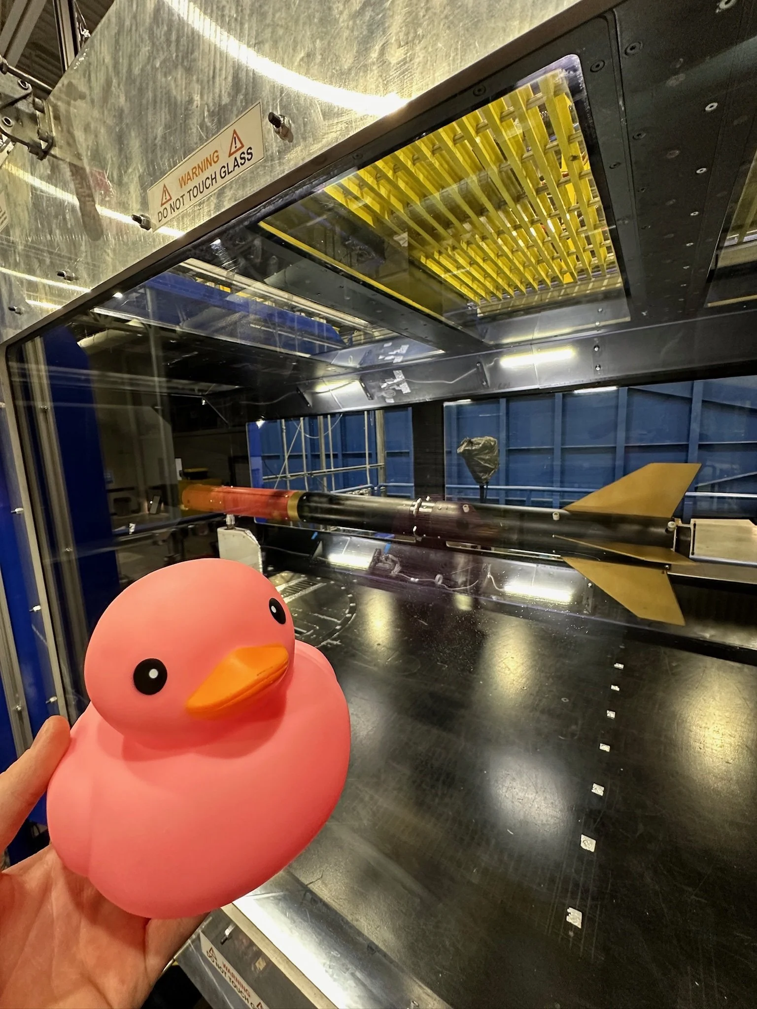 Testing began at 7 am sharp on Monday, February 17 (brutal). The team installed the rocket into the tunnel, confirmed the rocket’s integrity with a static loading test, and first collected load data at the worst-case of full ADS actuation at 350 ft/s, or about Mach 0.31. After verifying that the launch vehicle could withstand the maximum expected forces, the team swept through the test matrix, collecting force and moment data for speeds of 50-350 ft/s, angles of attack from 0 to 6°, and 0 to 100% ADS actuation. The team also conducted a dynamic test, varying the actuation from none to full, and observed the dynamic response.
